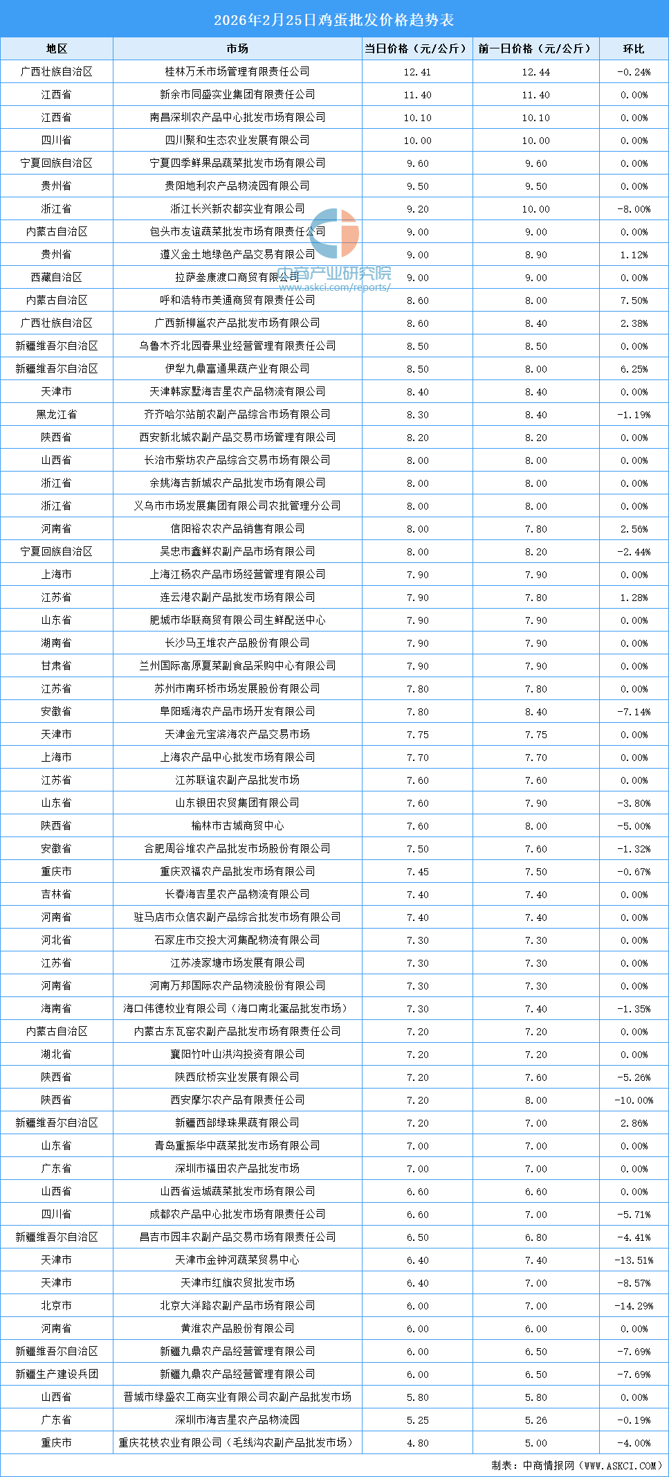中商情报网讯:最新数据显示:2月25日全国鸡蛋平均价格为7.75元/公斤。其中,鸡蛋价格最高的市场是桂林万禾市场管理有限责任公司,当日价格为12.41元/公斤,环比下跌0.24%。鸡蛋价格最低的市场是重庆花枝农业有限公司(毛线沟农副产品批发市场),当日价格为4.80元/公斤,环比下跌4.00%。