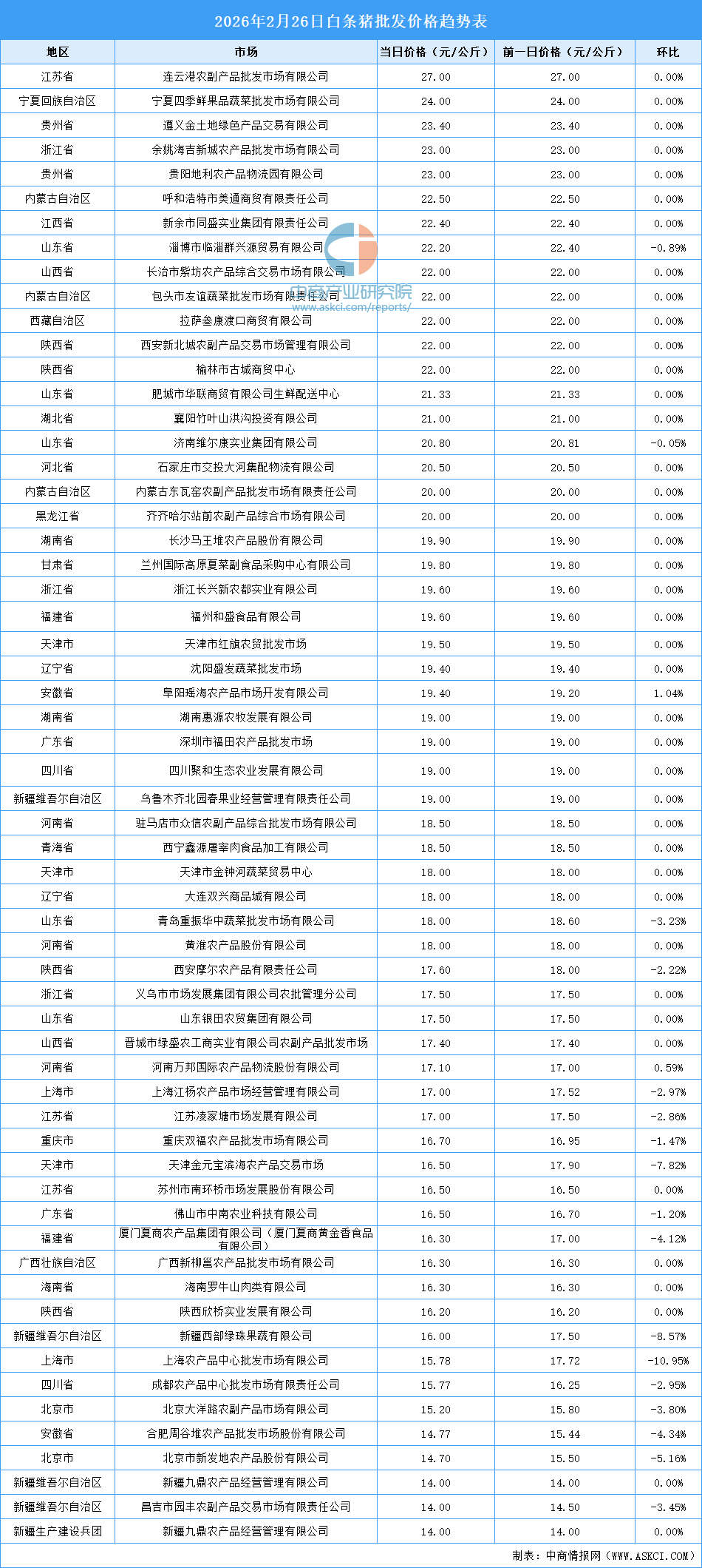 中商情报网讯:最新数据显示:2月26日全国白条猪平均价格为18.83元/公斤。其中,白条猪价格最高的市场是连云港农副产品批发市场有限公司,当日价格为27.00元/公斤,环比持平。白条猪价格最低的是昌吉市园丰农副产品交易市场有限责任公司和新疆九鼎农产品经营管理有限公司,当日价格均为14.00元/公斤。