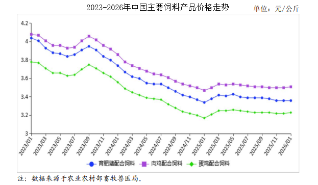 中商情报网讯:2026年1月,饲料价格持平略涨。春节后饲料和养殖企业补充原料库存,采购需求旺盛。玉米销售进度加快,基层余粮减少,市场主体囤粮积极性增加,价格稳中偏强。国内豆粕阶段性供给趋紧,价格小幅上涨。短期内,受原料成本支撑,饲料价格延续偏强运行。