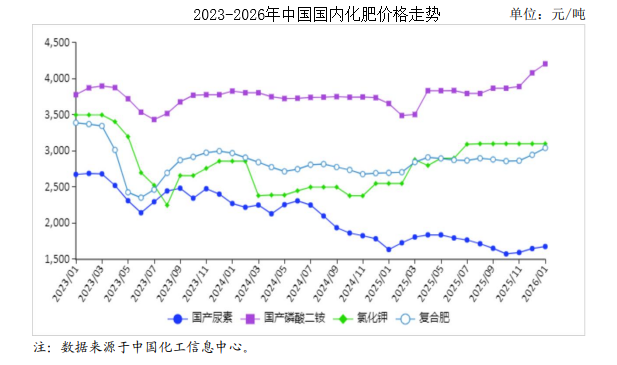 中商情报网讯:2026年1月,国内化肥价格稳中上涨。企业开工率正常,总体供应有保障,春耕备耕即将启动,市场需求增加,预计后期国内化肥价格平稳运行。