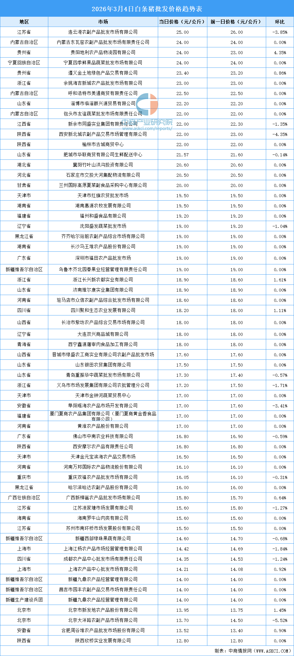 中商情报网讯:最新数据显示:3月4日全国白条猪平均价格为18.21元/公斤。其中,白条猪价格最高的市场是连云港农副产品批发市场有限公司,当日价格为25.00元/公斤,环比下跌3.85%。白条猪价格最低的是陕西欣桥实业发展有限公司,当日价格为12.80元/公斤,环比持平。