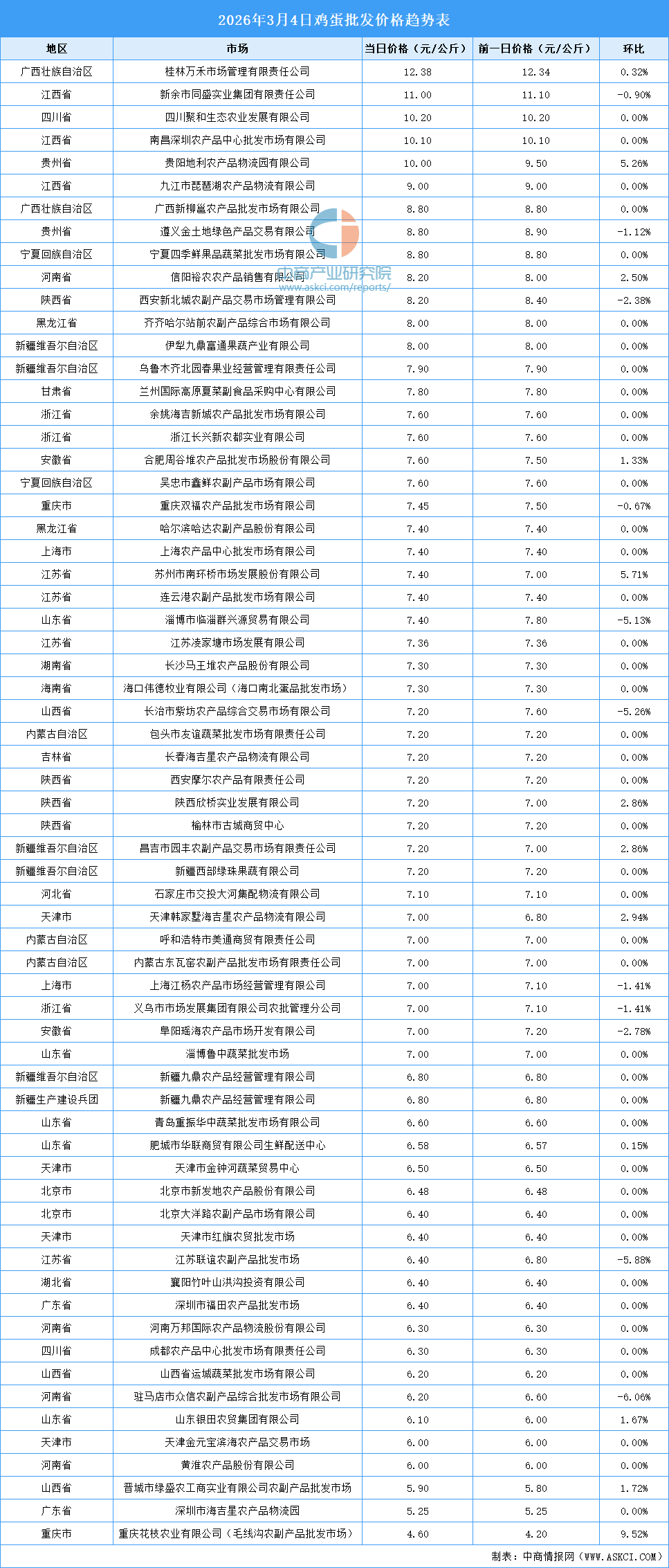 中商情报网讯:最新数据显示:3月4日全国鸡蛋平均价格为7.36元/公斤。其中,鸡蛋价格最高的市场是桂林万禾市场管理有限责任公司,当日价格为12.38元/公斤,环比上涨0.32%。鸡蛋价格最低的市场是重庆花枝农业有限公司(毛线沟农副产品批发市场),当日价格为4.60元/公斤,环比上涨9.52%。