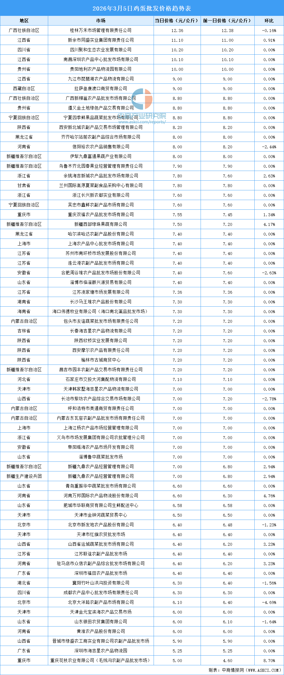 中商情报网讯:最新数据显示:3月5日全国鸡蛋平均价格为7.40元/公斤。其中,鸡蛋价格最高的市场是桂林万禾市场管理有限责任公司,当日价格为12.36元/公斤,环比下跌0.16%。鸡蛋价格最低的市场是重庆花枝农业有限公司(毛线沟农副产品批发市场),当日价格为5.00元/公斤,环比上涨8.70%。