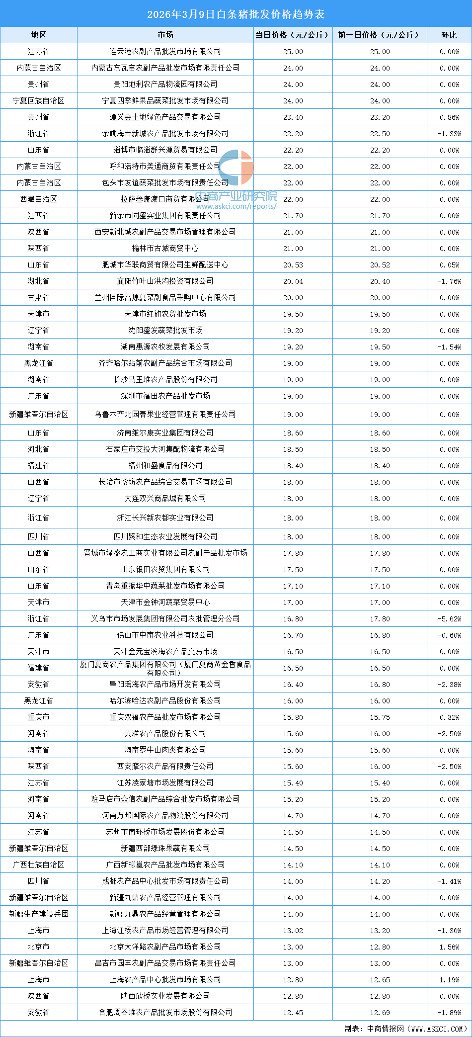 中商情报网讯:最新数据显示:3月9日全国白条猪平均价格为17.88元/公斤。其中,白条猪价格最高的市场是连云港农副产品批发市场有限公司,当日价格为25.00元/公斤,环比持平。白条猪价格最低的是合肥周谷堆农产品批发市场股份有限公司,当日价格为12.45元/公斤,环比下跌1.89%。