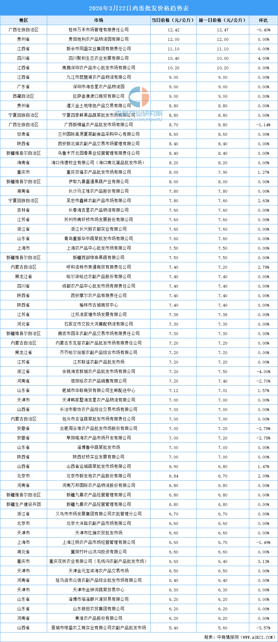 中商情报网讯:最新数据显示:3月22日全国鸡蛋平均价格为7.63元/公斤。其中,鸡蛋价格最高的市场是桂林万禾市场管理有限责任公司,当日价格为12.42元/公斤,环比下跌0.40%。鸡蛋价格最低的市场是晋城市绿盛农工商实业有限公司农副产品批发市场,当日价格为5.40元/公斤,环比下跌3.57%。