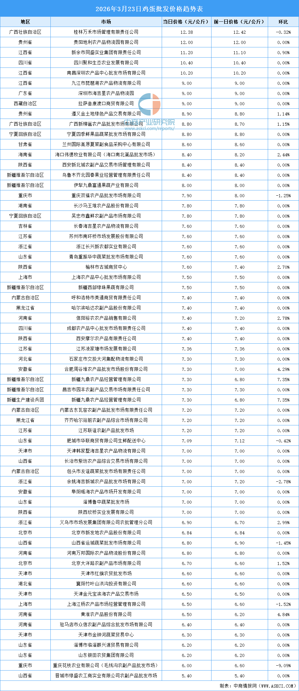 中商情报网讯:最新数据显示:3月23日全国鸡蛋平均价格为7.65元/公斤。其中,鸡蛋价格最高的市场是桂林万禾市场管理有限责任公司,当日价格为12.38元/公斤,环比下跌0.32%。鸡蛋价格最低的市场是晋城市绿盛农工商实业有限公司农副产品批发市场,当日价格为5.40元/公斤,环比持平。