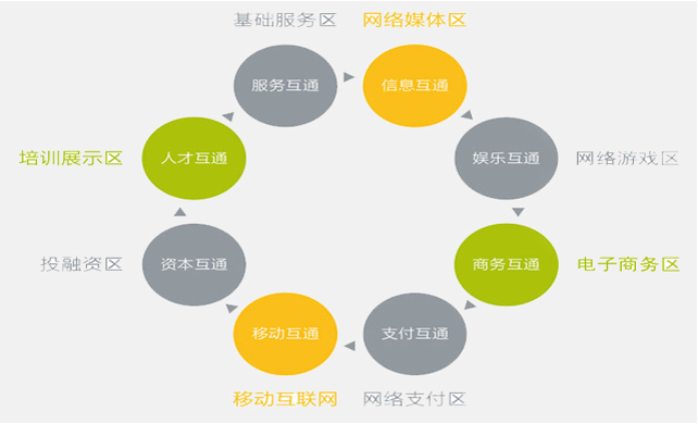 GIIP内设置了八大功能区,产业园引导和促进不同功能区间的八大资源互通,逐步构建互联网产业价值链,为企业提供综合系统性服务,把产业园构建成为集产、学、研、政、介为一体的互联网创新服务基地。