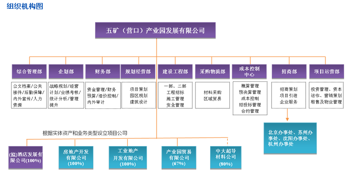 五矿(营口)产业园公司注册资本4亿元人民币,中国五矿集团持股100%。公司设立综合管理部、企划部、财务部等8个职能部门,全面负责园区的规划建设、招商引资及运营管理。