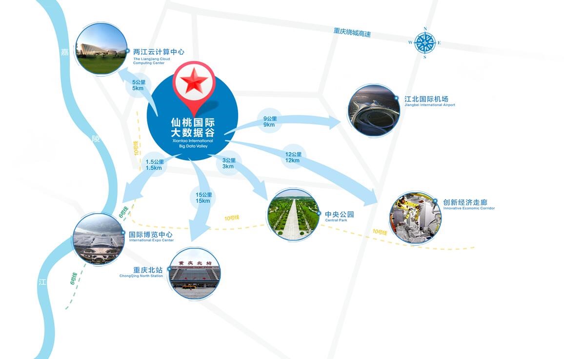 仙桃国际大数据谷所在的渝北区位于重庆主城区北部,是首批国家临空经济示范区、全国第三个国家级新区—两江新区的核心组成部分。仙桃国际大数据谷距离江北国际机场9km、两江国际云计算中心5km、国际博览中心1.5km、重庆北站15km、中央公园3km、创新经济走廊12km;三面环水半岛,区位优势明显,交通条件便捷。