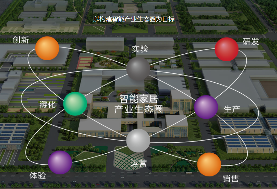 园区以智能家居产品为核心,划分为八大功能区:展示区、研发区、生产区、储运区、实验区、数据区、教育区,生活区。建设内容有:10大功能模块(1智能双创中心、2智能生活中心、3智能制造中心、4智能数据中心、5智能能源管理中心、6智能培育中心、7智能实验中心、8智能仓储中心、9智能体验中心、10智能研发中心)