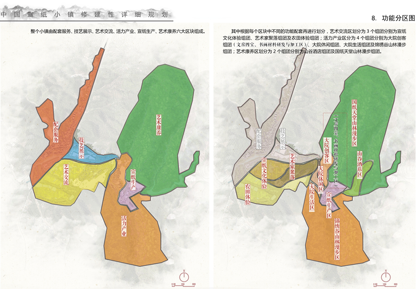 宣纸小镇由配套服务、技艺展示、艺术交流、活力产业、宣纸生产、艺术康养六大区组成。