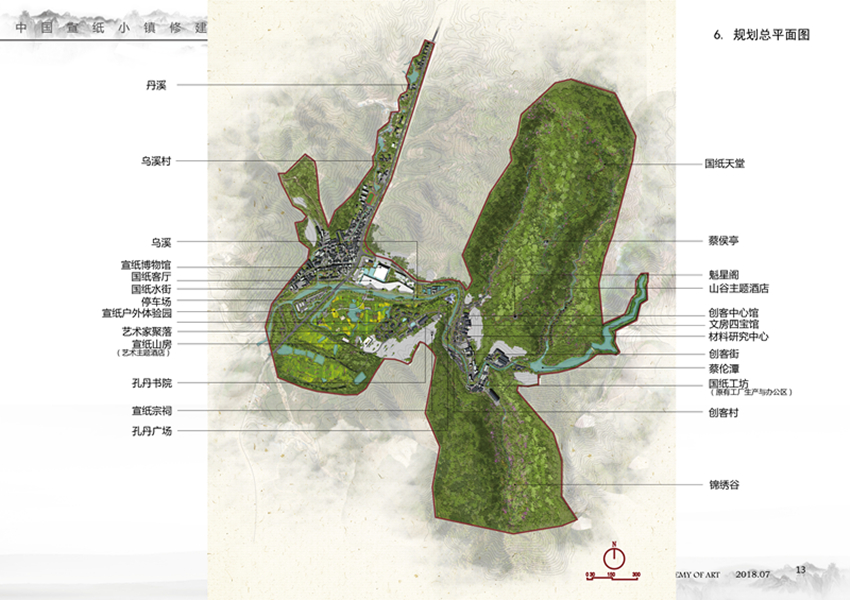 项目分三期建设。一期:建筑面积20310.44平方米。文化展示区由国纸客厅国纸水街组成。国纸客厅含售票处、宣纸大课堂、多媒体互动厅。国纸水街分为宣纸体验园和宣纸展示大厅。二期: 建筑面积82633.14平方米。文创艺术区、艺术家村落组成。宣纸文化体验园有以宣纸制作工艺的檀园、草园、藤园、碓园、帘园;以宣纸有关名人的彦远园、即之园、可染园、叶挺园。艺术家村落主要由孔丹书院与艺术家工作室共同组成。三期:包含村庄配套服务区、活力产业区、生态康养区。村庄配套服务区依托乌溪村,对村庄内中心街、周边民房及老系统进行升级。活力产业区由创客中心、文房四宝馆、材料中心、创客街、剧院、创客休闲区、工厂区组成。生态康养区含山谷主体度假酒店,登山步道、蔡伦潭、魁星阁。
