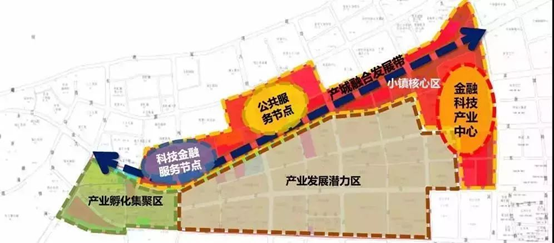 两点:公共服务节点。公共服务节点主要集聚小镇的行政服务机构及产业公共服务平台,为金融科技产业发展提供良好的支撑配套环境。