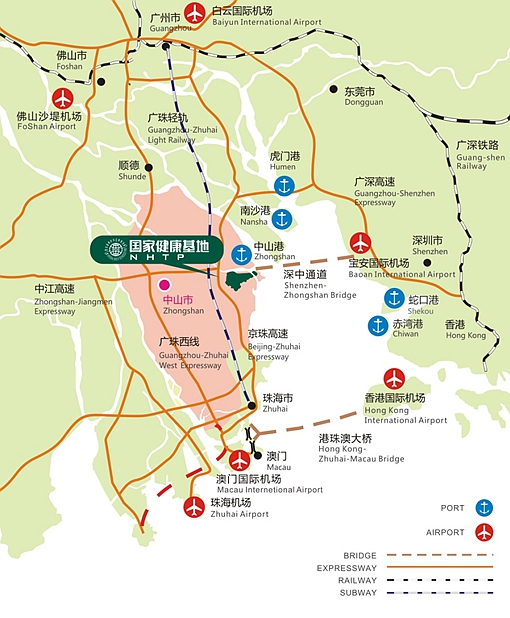 中山市是全国首个地级“国家生态市”,也是国家生态文明建设试点城市,1997年更被联合国授予“人居奖”。国家健康基地位于中山东部,地处粤港澳大湾区的几何中心,东临珠江口,与深圳、香港隔海相望,南与珠海、澳门毗邻,北接佛山、广州。以中山为圆心,周边90公里半径有香港、澳门、广州、深圳、珠海、佛山6大机场,以及中山港、南沙港等5大外轮深水港;京珠高速公里纵贯中山全境,并且随着广珠轻轨、深茂铁路、深中通道以及港珠澳大桥等重大交通工程的规划和建设,让交通变得十分便利,区位优势凸显,形成珠三角一小时经济圈。
